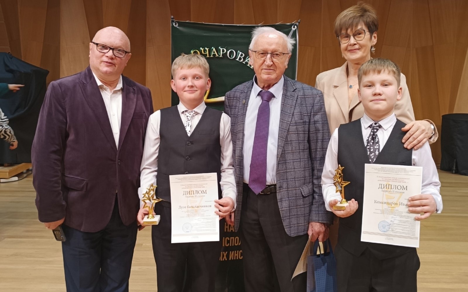 • Дуэт балалаечников: Строганов Артём и Комендаров Иван (учащийся НДШИ им. В.Л. Калаберды) — Лауреат III степени (преподаватель А.И. Комендарова, концертмейстер С.П. Корчагин);
