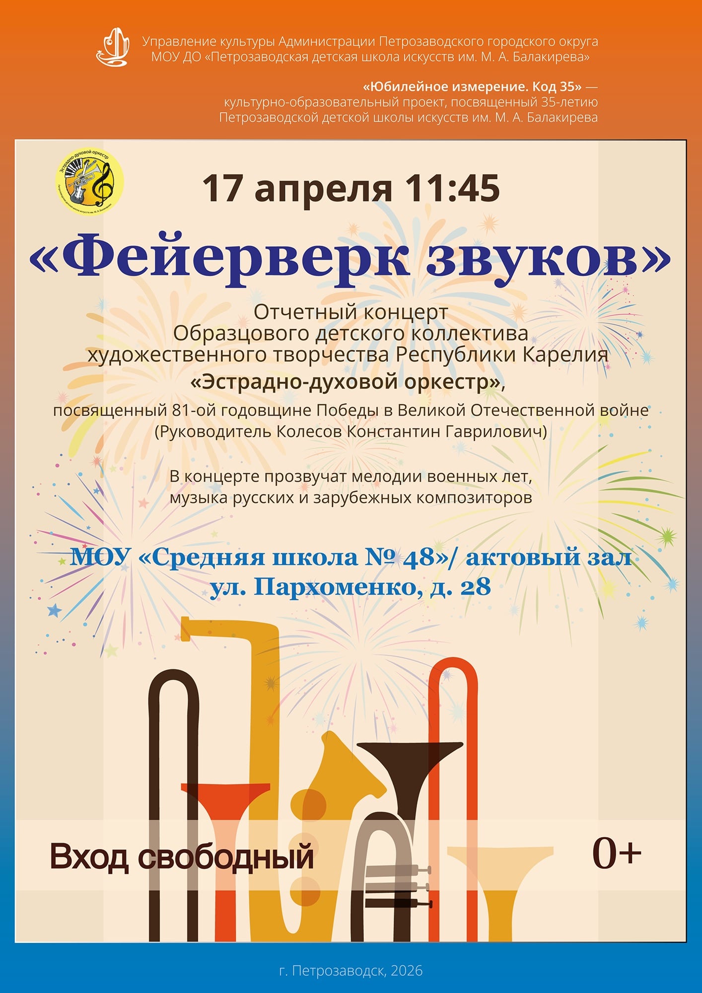 Отчетный концерт Образцового детского коллектива художественного творчества Республики Карелия «Эстрадно-духовой оркестр», посвященный 81-ой годовщине Победы в Великой Отечественной войне (Руководитель Колесов Константин Гаврилович).