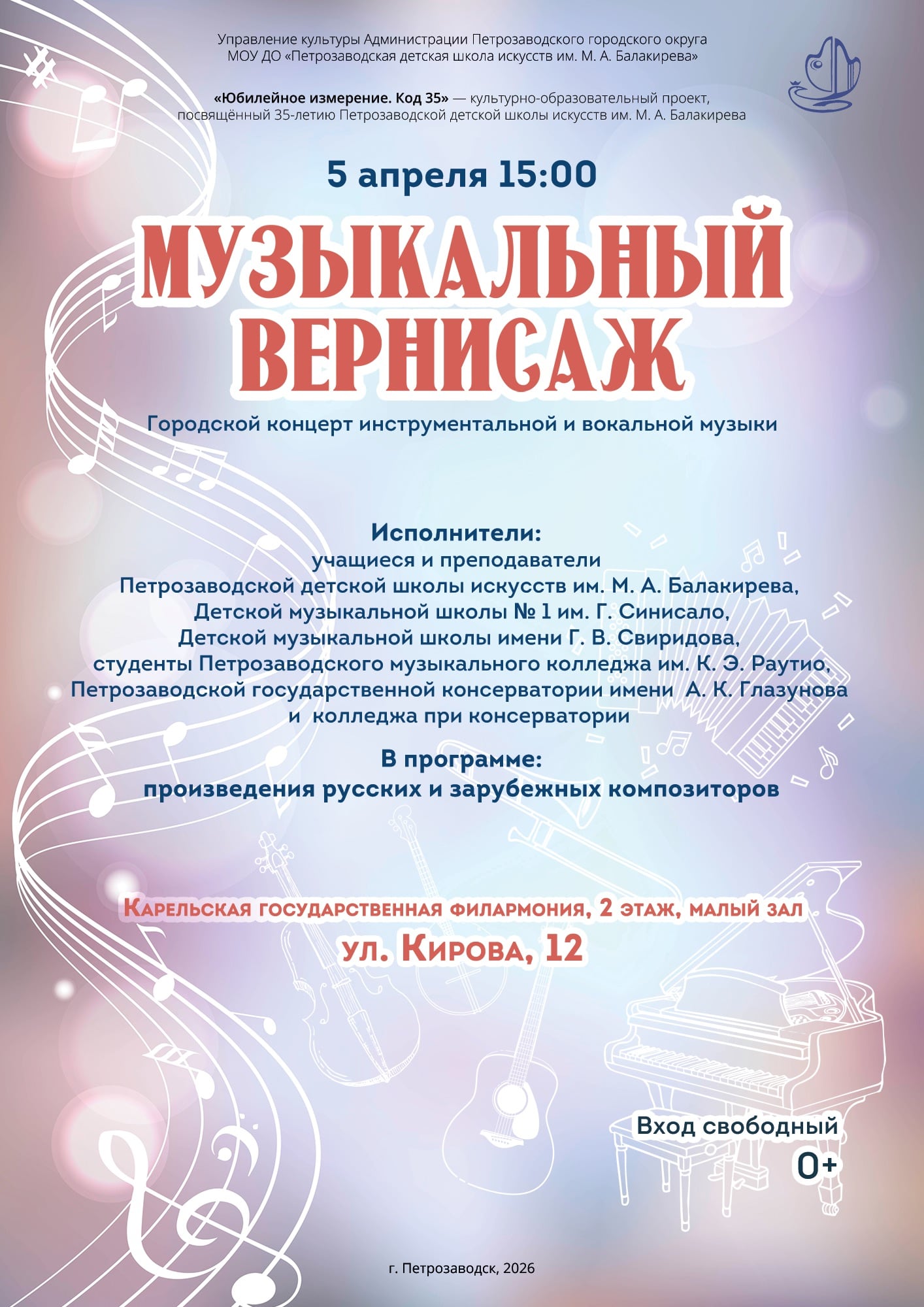 Исполнители: учащиеся и преподаватели Петрозаводской детской школы искусств им. М. А. Балакирева, Детской музыкальной школы Nº 1 им. Г. Синисало, Детской музыкальной школы имени Г. В. Свиридова, студенты Петрозаводского музыкального колледжа им. К. Э. Раутио, Петрозаводской государственной консерватории имени А. К. Глазунова и колледжа при консерватории.