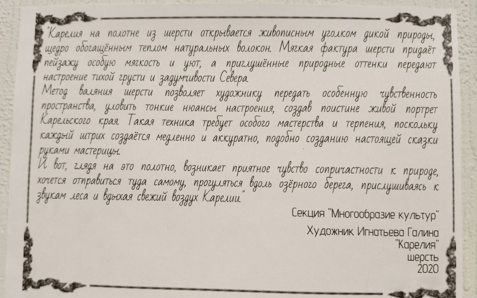Среди участников выставки – преподаватель Петрозаводской детской школы искусств им. М.А.Балакирева Галина Юрьевна Игнатьева. Её работа «Карелия», которая выполнена методом валяния шерсти (техника «фелтинг»), стала «представителем» секции «Многообразие культур».Техника «фелтинг» отражает традиционные ремесла разных народов мира. И корни этой техники уходят в далекое прошлое.