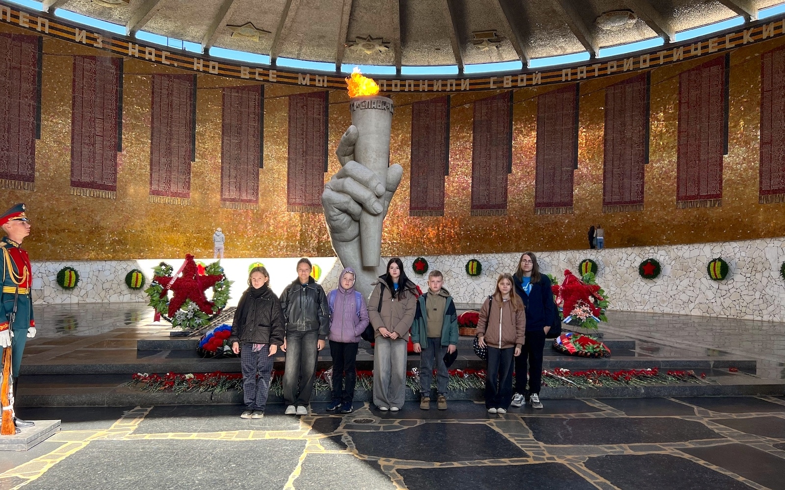 «Запомнилась акция на Мамаевом кургане. Я познакомилась с детьми из других городов. Во время построения флага очень красиво звучал оркестр, а ещё мы увидели смену почётного караула!...» (Диана Тарачева);